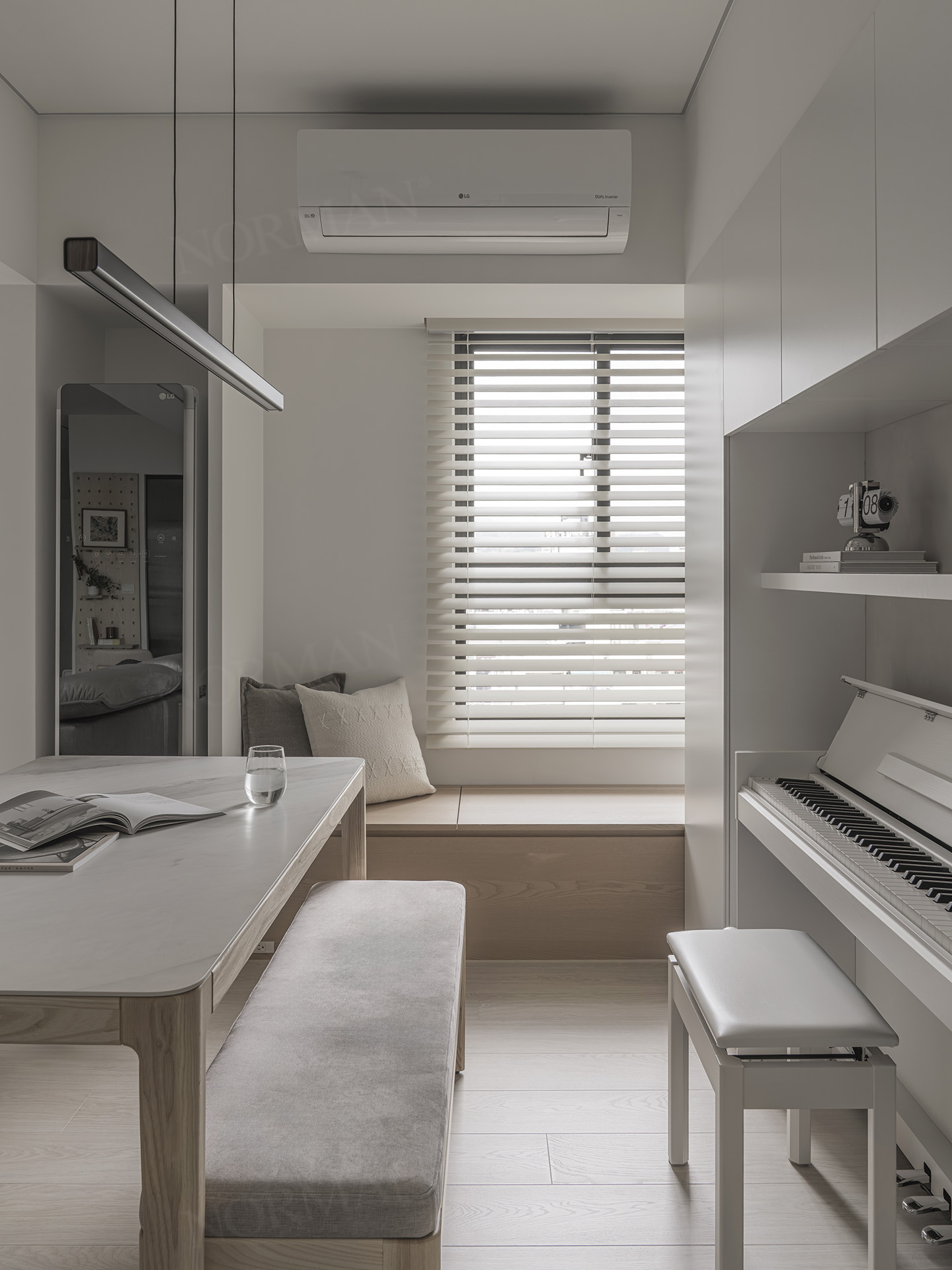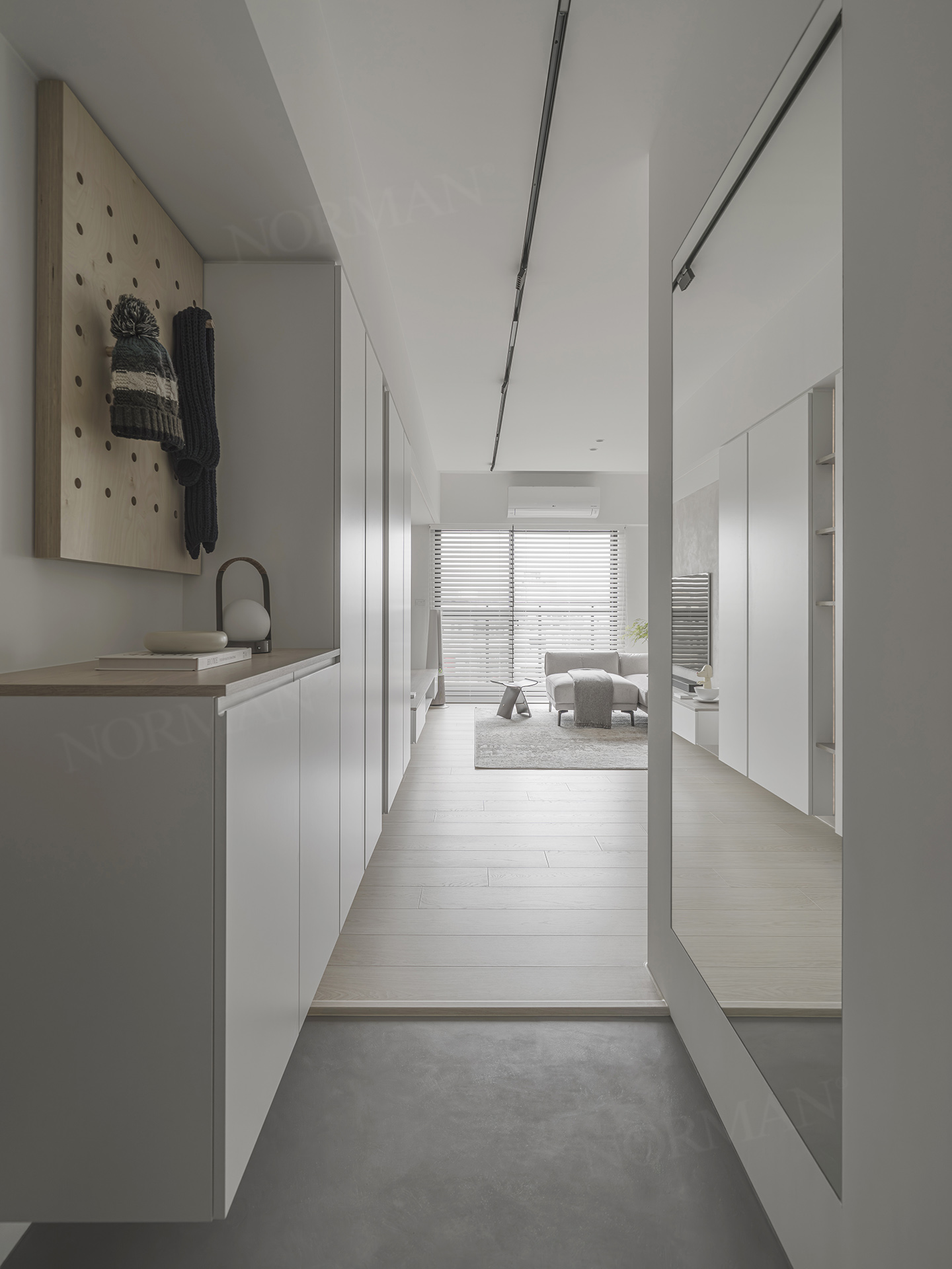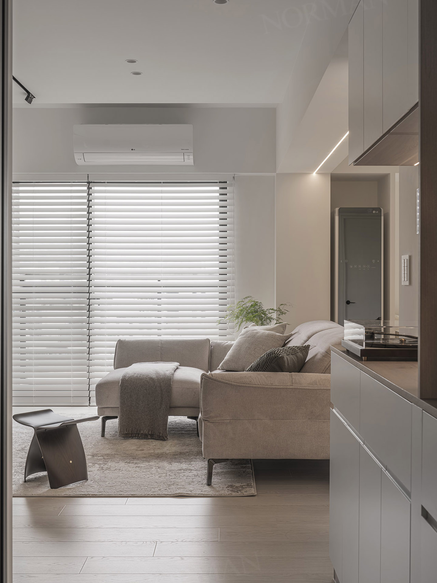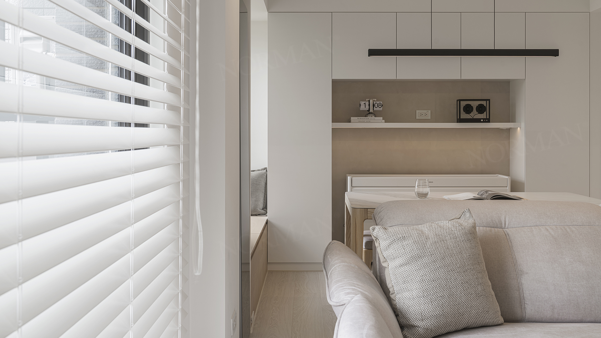 本案設計師以白色為主軸,選用 NORMAN 木百葉簾。設計師特意挑選帶有溫潤感的絲綢白與亞麻白,避免過於冷調,同時保留空間的清爽與明亮。透過細緻的色階變化,使整體室內裝修在純淨之中,依然保有豐富的層次與表情。