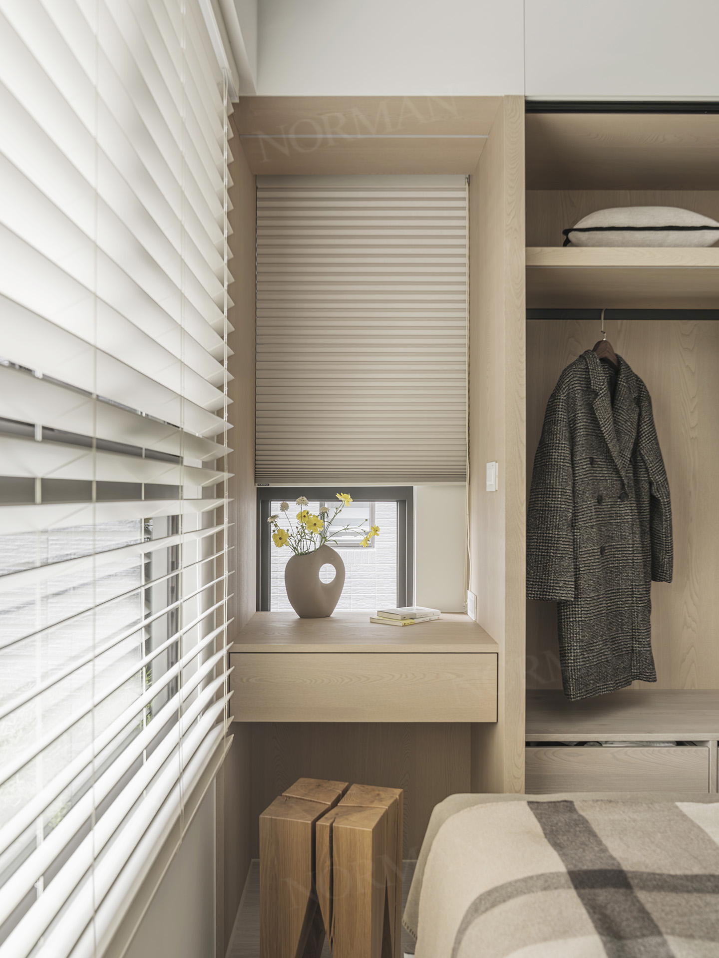 相較之下,NORMAN 百葉簾與風琴簾皆為貼合窗框的設計,收起時俐落簡潔,不額外佔用空間,讓窗邊區域得以完整保留,回歸生活本身的使用需求。